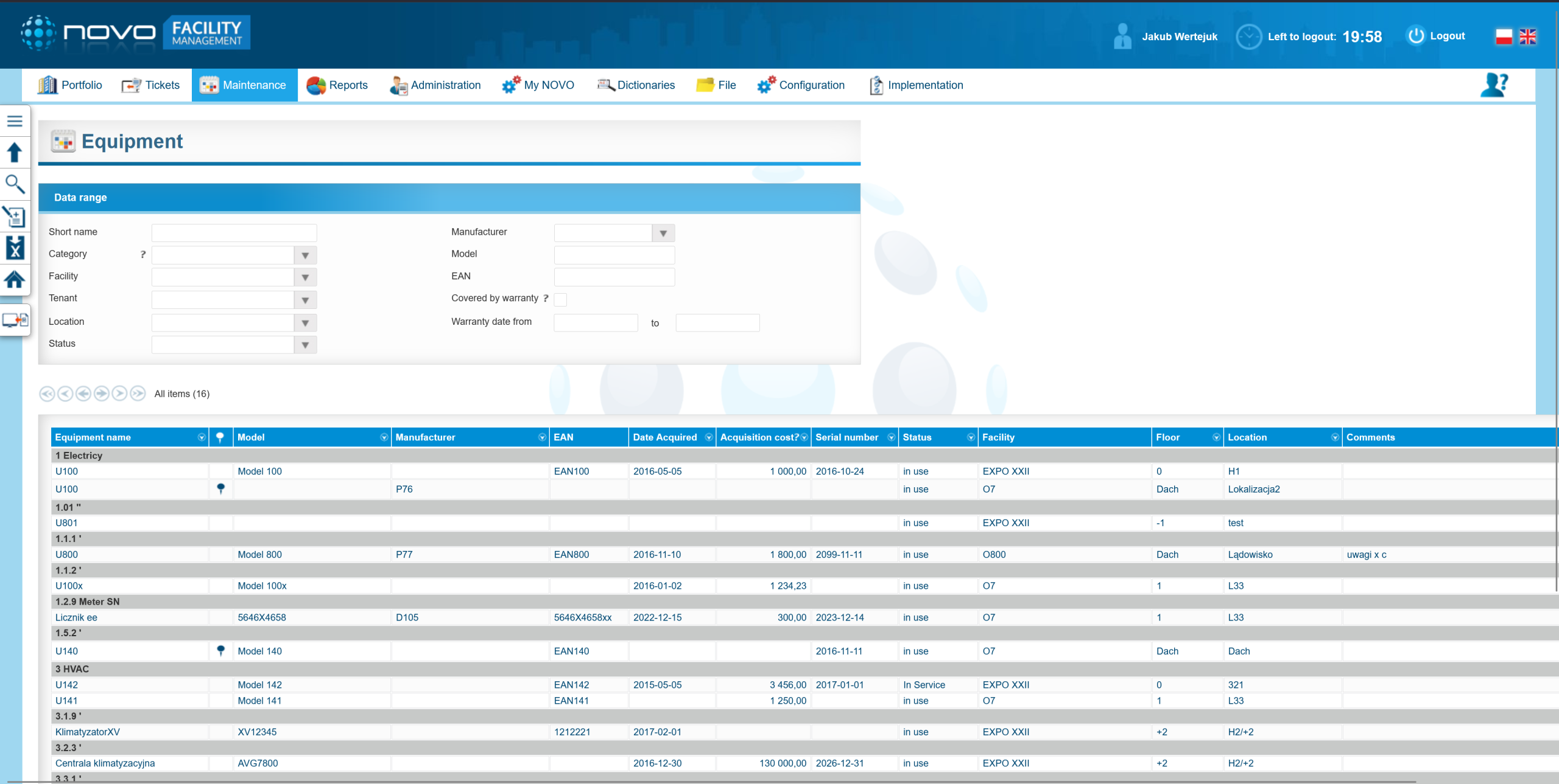 NOVO FM modulis naudoja išsamią įrenginių kategorizavimo sistemą su 5 lygiais, kuri buvo sukurta bendradarbiaujant su patyrusiais pastatų valdymo (FM) vadovais. Naudotojai taip pat gali naudoti savo pasirinktą kategorizaciją, kurią galima lengvai įkelti į modulį naudojant iš anksto paruoštas Excel formas. Pats įrenginys gali būti aprašytas pagal keletą parametrų, pavyzdžiui: pirkimo data, rekomenduojamos patikros, gamintojas, prekės ženklas, gyvavimo ciklas ir kt.